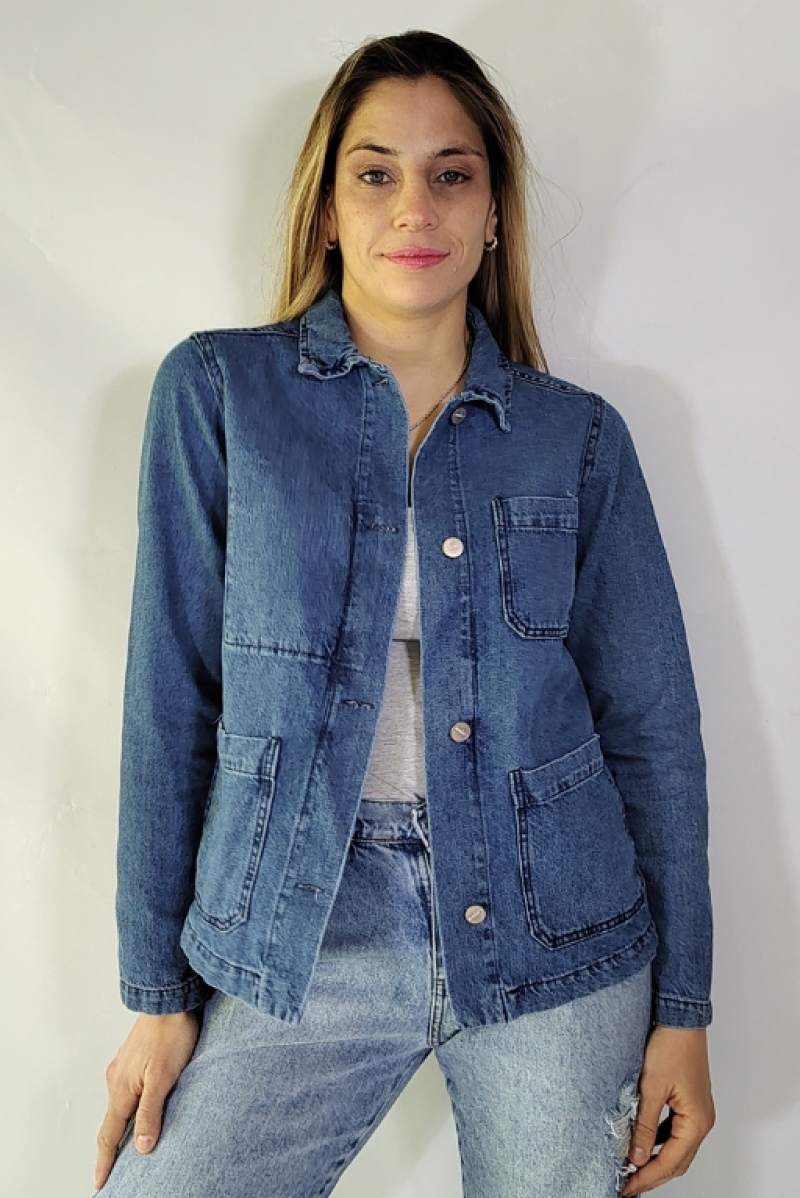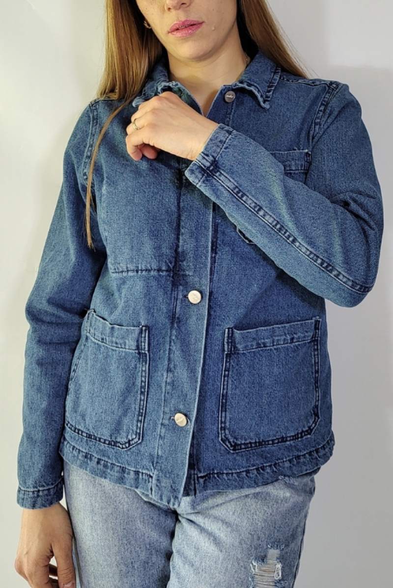 Campera Jacket JEAN RIGIDO azul con bolsillos delanteros.
