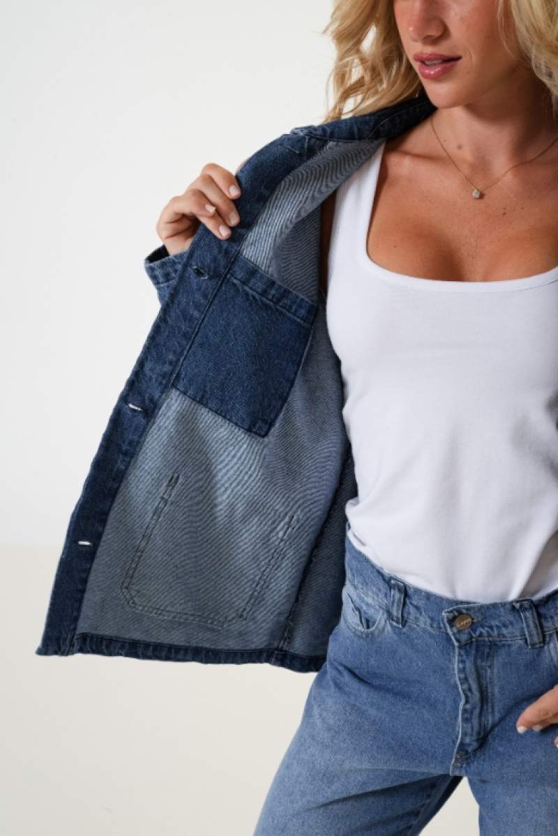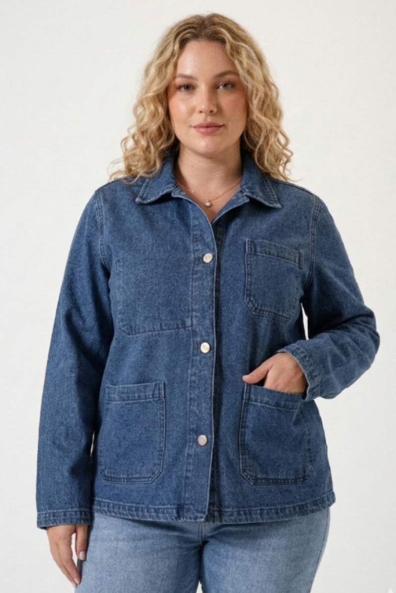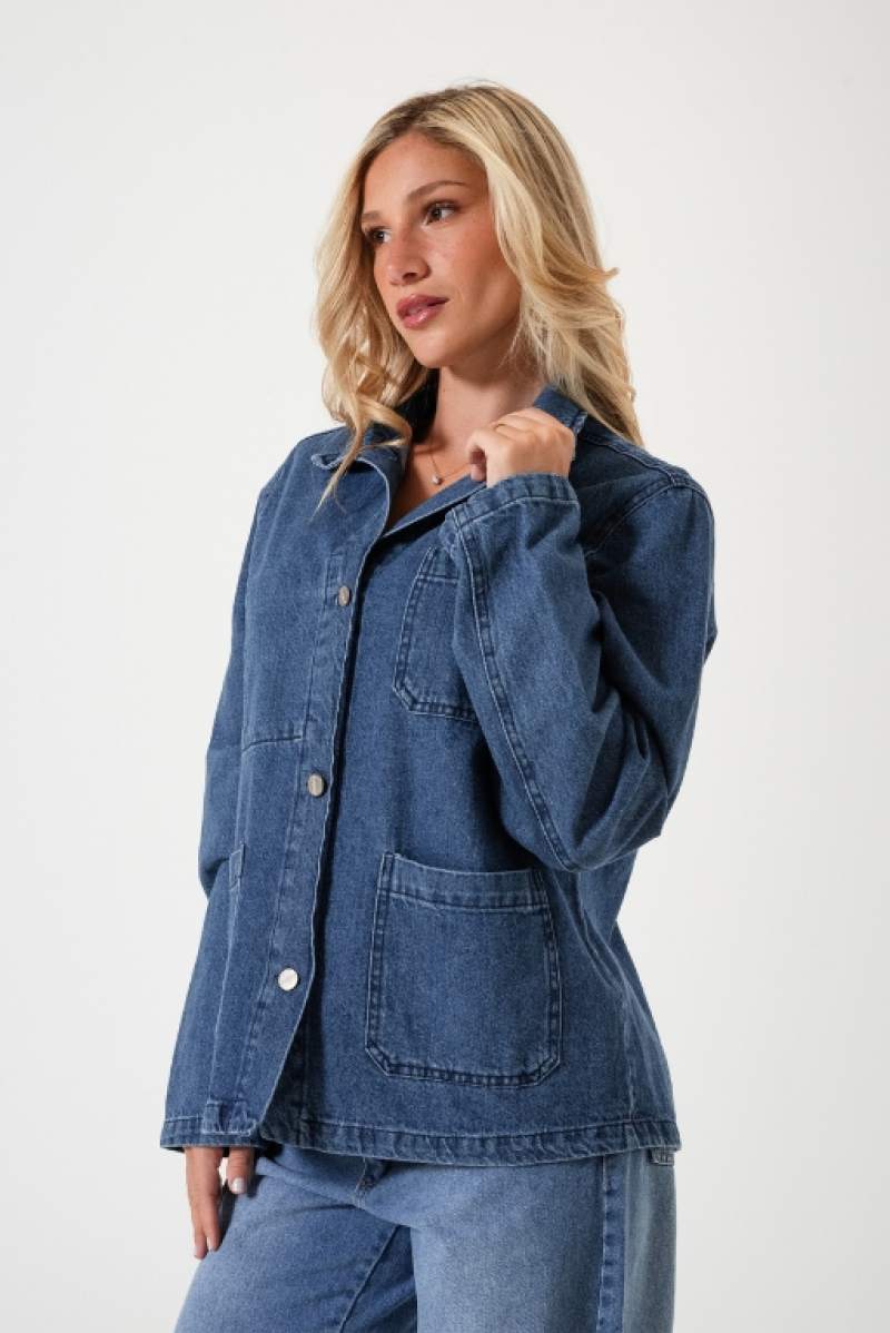 Campera chaqueta JEAN RIGIDO azul con bolsillos delanteros.
