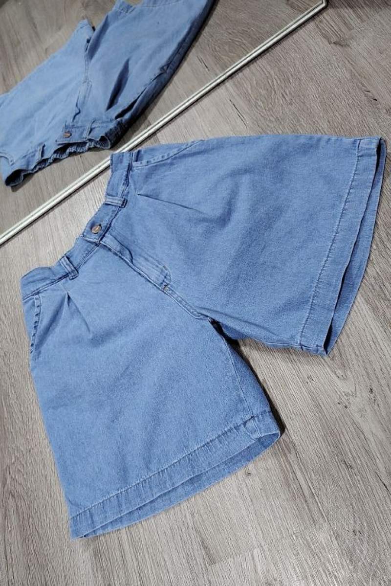 Bermuda de jean camisero fino (NO ELASTIZADO) celeste, con media cintura elástica, comoda y fresca