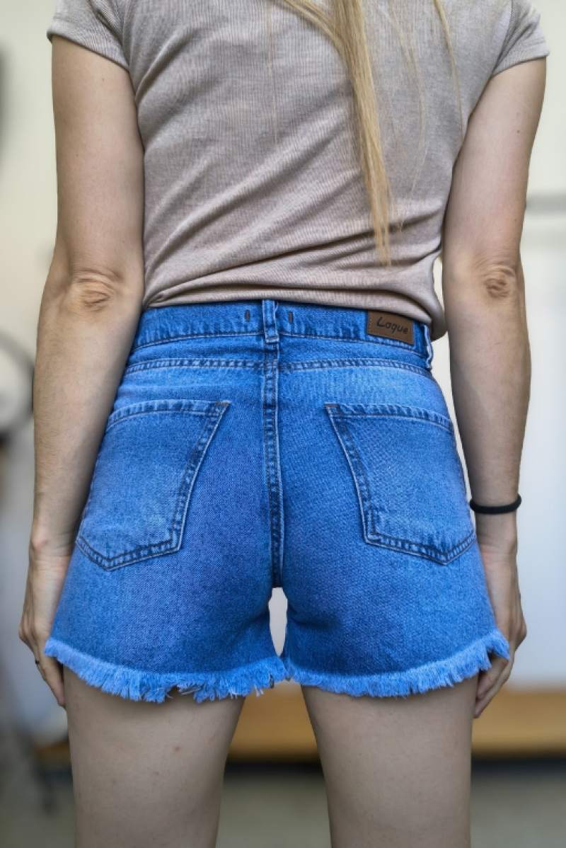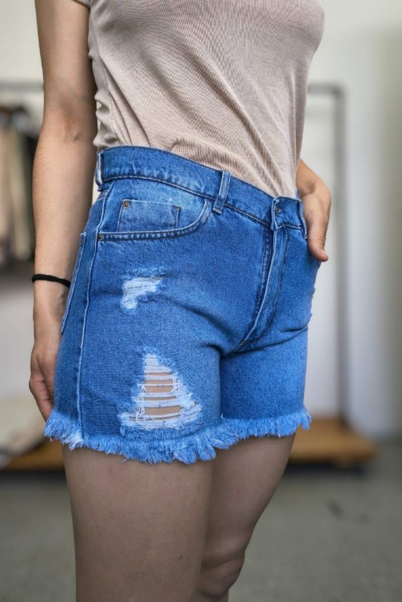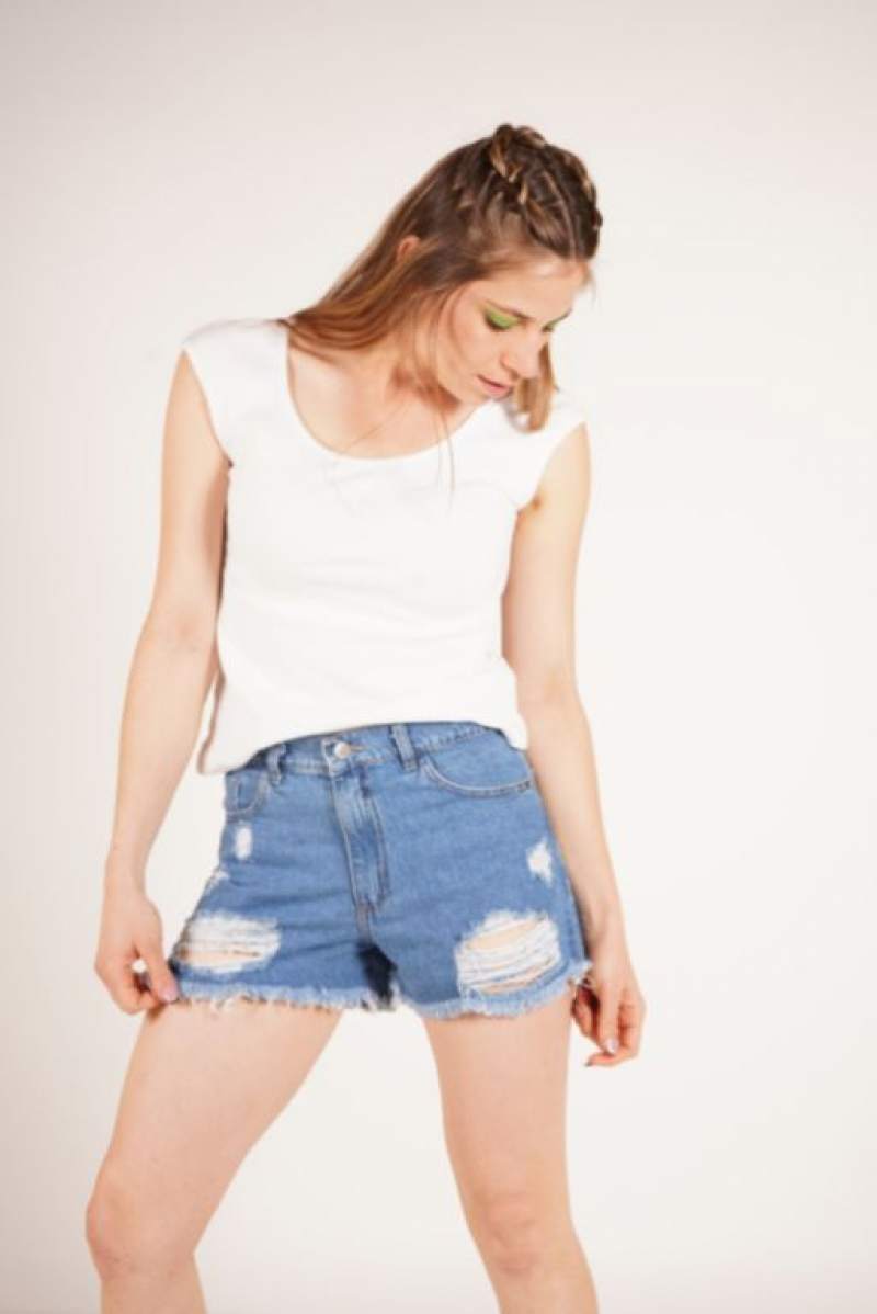 Short de jean corte MOM de jean rigido, tiro medio con roturas.