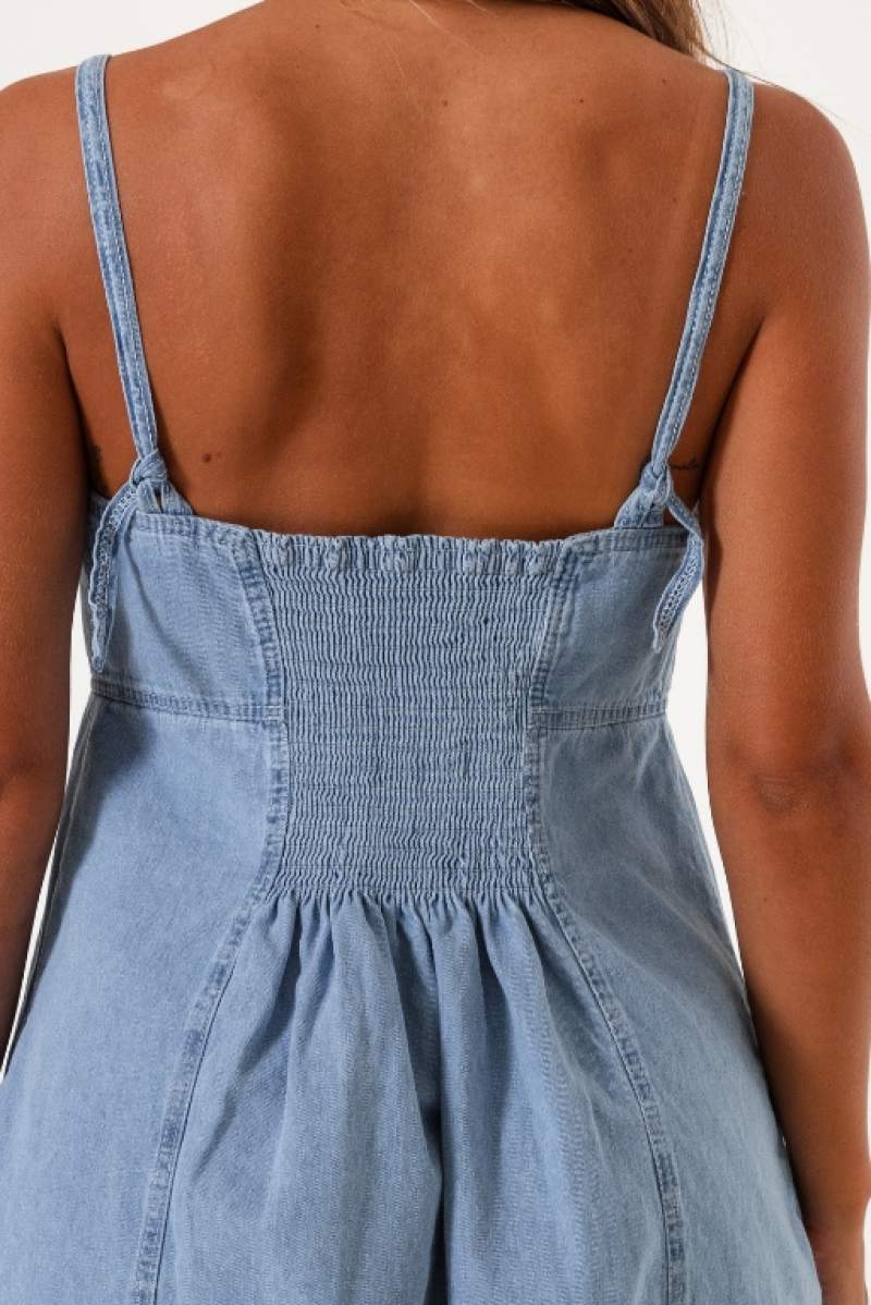 Vestido Solero de jean Camisero Celeste, super fresco y canchero, con tiras regulables, elástico y corte evasé ideal para no marcar el abdomen